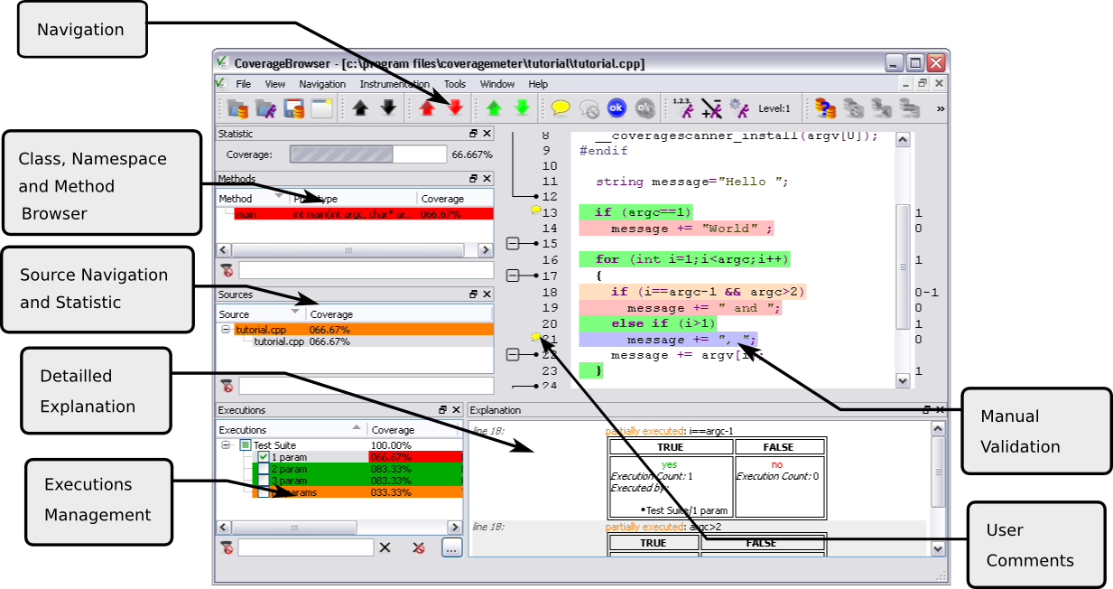 The execution report in the .csexe file can be analyzed and managed with the CoverageBrowser tool. This program has a GUI (graphical user interface) by which the user can browse and manage their execution reports. This makes it straightforward to locate untested or unreachable code and inefficient tests.