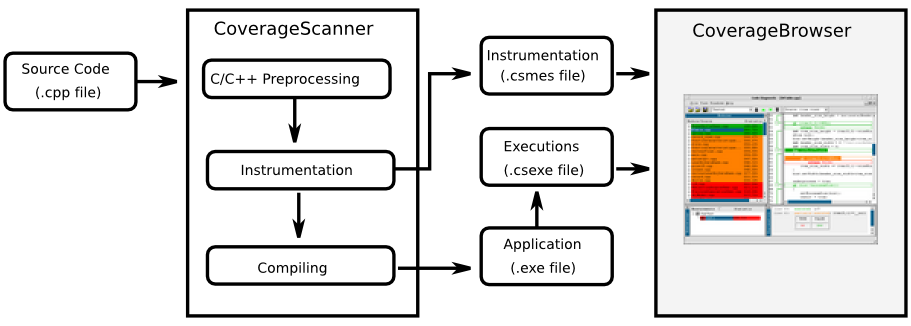 CoverageScanner is a command line tool that replaces the compiler normally used to build the executable, library, or plugin. It inserts special instrumentation instructions into the preprocessed source code and then uses the original compiler to compile the modified code. At the same time, a database (the .csmes file) is generated for later analysis. It contains the list of instrumentations and a copy of the instrumented source code.