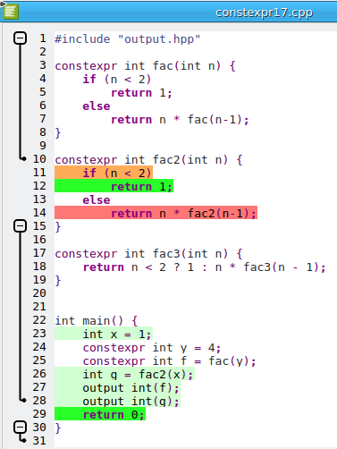 #include "output.hpp" constexpr int fac(int n) { if (n < 2) return 1; else return n * fac(n-1); } constexpr int fac2(int n) { if (n < 2) return 1; else return n * fac2(n-1); } constexpr int fac3(int n) { return n < 2 ? 1 : n * fac3(n - 1); } int main() { int x = 1; constexpr int y = 4; constexpr int f = fac(y); int g = fac2(x); output_int(f); output_int(g); return 0; }
