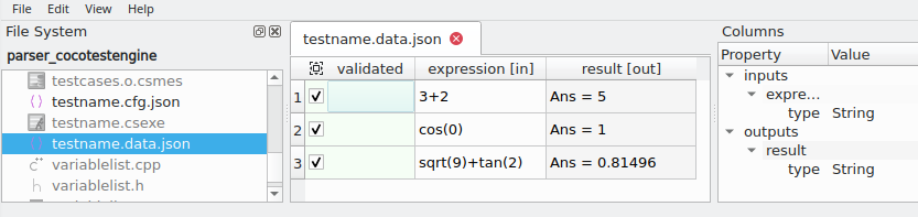 Since the data files are stored in JSON format, they can be created and modified in any text editor. For convenience, Coco includes a Test Data Editor tool that allows viewing and editing data files in tabular form. The executable named testdataeditor can be found in the Coco binary directory. It takes in as arguments a directory or a list of data files to open.