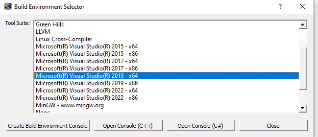 Initially, toolselector presents you with a list of different compilers. Selecting one shows you some buttons. One button allows you to choose a directory where that compiler is installed. If a valid location is set, you will see other buttons depending on which compiler is selected, such as Open Console, Create Console, or Install Support.