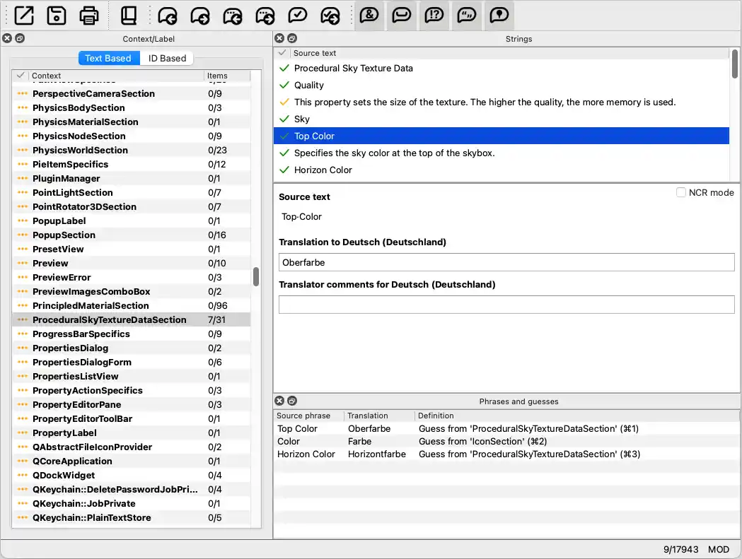 - Select a context in the Context view to display translatable strings in the Strings view.