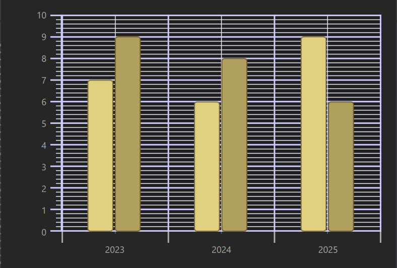 import QtQuick import QtGraphs GraphsView { anchors.fill: parent theme: GraphsTheme { colorScheme: GraphsTheme.ColorScheme.Dark seriesColors: ["#E0D080", "#B0A060"] borderColors: ["#807040", "#706030"] grid.mainColor: "#ccccff" grid.subColor: "#eeeeff" axisY.mainColor: "#ccccff" axisY.subColor: "#eeeeff" } axisX: BarCategoryAxis { categories: ["2023", "2024", "2025"] lineVisible: false } axisY: ValueAxis { min: 0 max: 10 subTickCount: 4 } BarSeries { BarSet { values: [7, 6, 9] } BarSet { values: [9, 8, 6] } } }