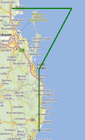 The following snippet shows a MapPolyline with 4 points, making a shape like the top part of a "question mark" (?), near Brisbane, Australia. The line drawn is 3 pixels in width and green in color.