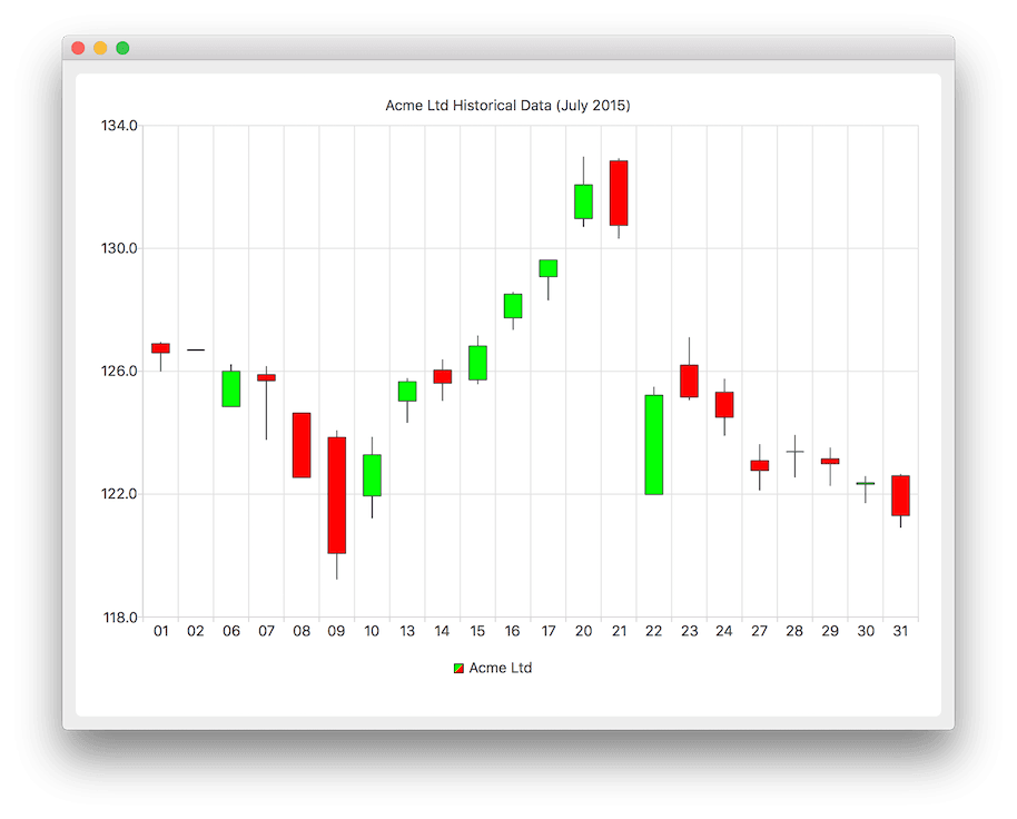A candlestick chart is implemented by using the QCandlestickSeries and QCandlestickSet classes or the CandlestickSeries and CandlestickSet QML types.