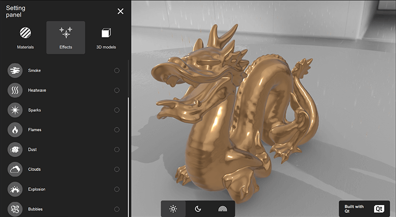 Demonstrates material and effects capabilities of Qt Quick 3D. This example demonstrates how you can use particle effects and materials in Qt Quick 3D.