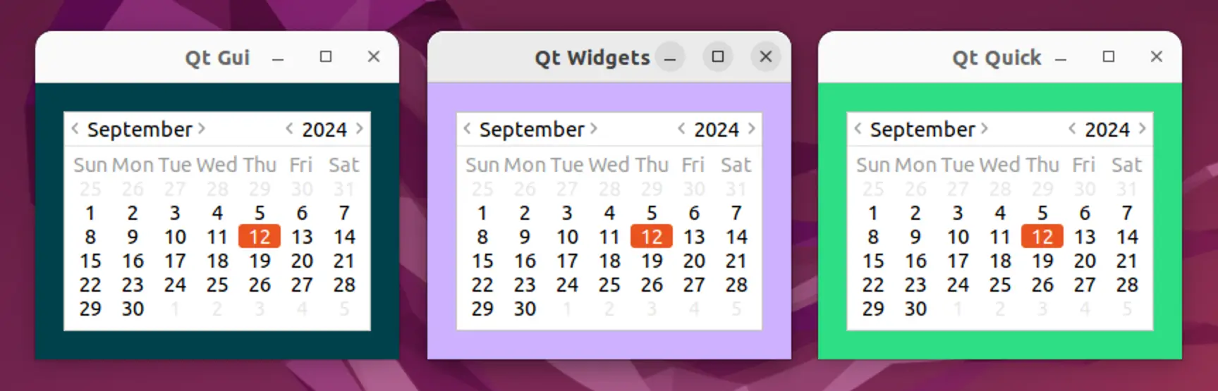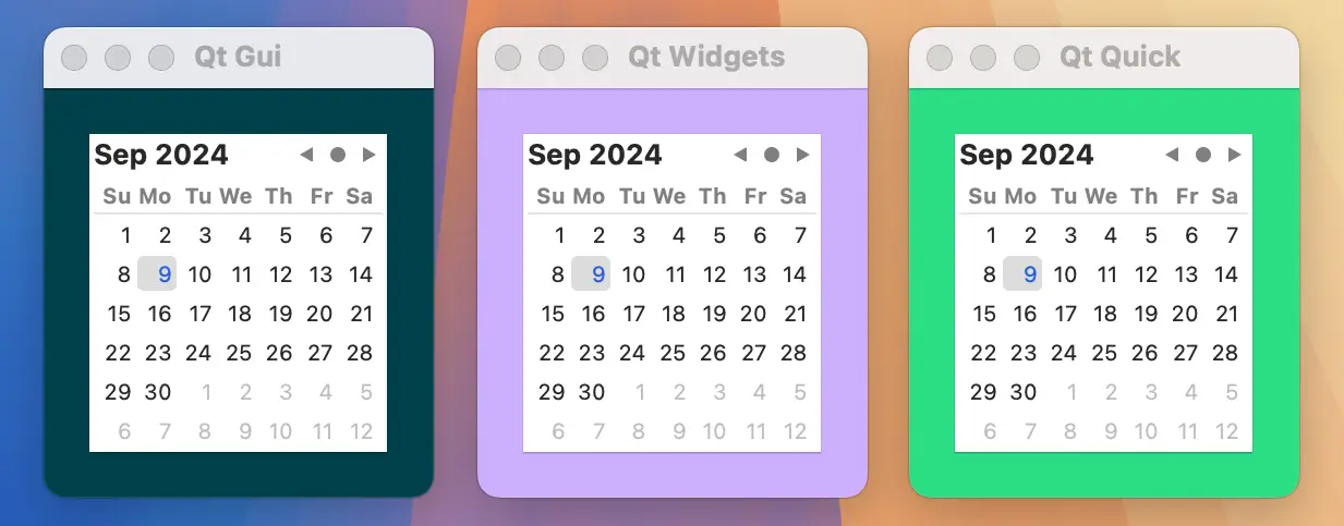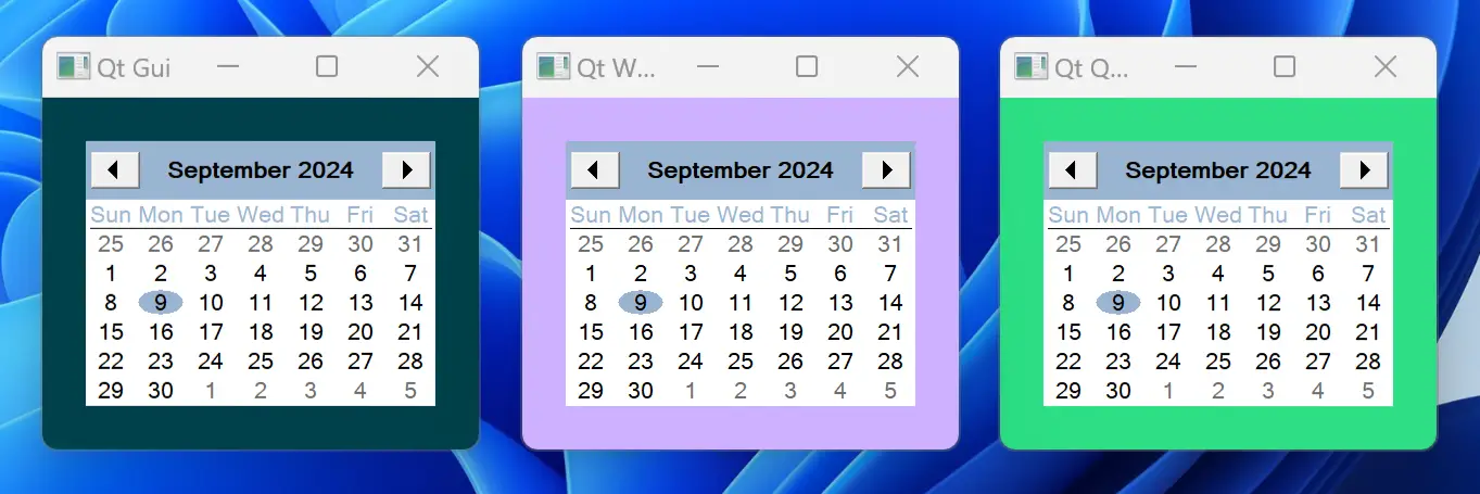 QWidget widget; widget.setPalette(QColor("#CDB0FF")); widget.setWindowTitle("Qt Widgets"); widget.setLayout(new QVBoxLayout); widget.layout()->setContentsMargins(contentsMargins); widget.layout()->setAlignment(Qt::AlignCenter); auto *calendarWidget = QWidget::createWindowContainer(createCalendarWindow()); widget.layout()->addWidget(calendarWidget);