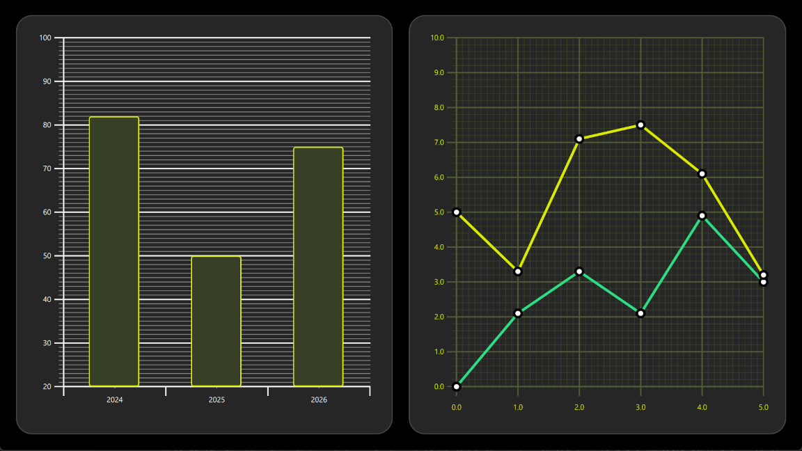 The second graph of the example is a line graph. It also starts by defining a GraphsView element. Custom GraphsTheme is created to get a custom appearance. GraphsTheme offers quite a wide range of customization possibilities for the background grid and axis, which get applied after the theme.