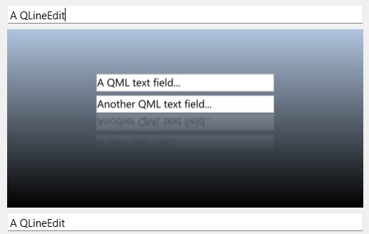 Note: Using native window embedding is just one possible approach to combining QWidget and Qt Quick user interfaces. The other, more commonly used approach for this is QQuickWidget. See the Qt Quick Widgets Example for an example of using QQuickWidget. There are significant differences internally when it comes to rendering and event handling. QQuickWidget does not use native windows at all and redirects the Qt Quick rendering into a texture that is then composited with the rest of the QWidget content via a 3D graphics API such as OpenGL or Vulkan. This brings more flexibility, at the expense of performance. It also works on platforms where there is no actual windowing system and no concept of native windows. Whereas the window embedding approach demonstrated by this example can be more performant, but it is best suited for user interfaces where the Qt Quick content occupies a fixed rectangular area and is not resized, stacked, or clipped afterwards.