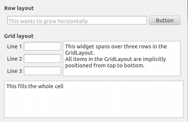 This example shows how to easily arrange UI components into layouts with GridLayout, RowLayout, and ColumnLayout.