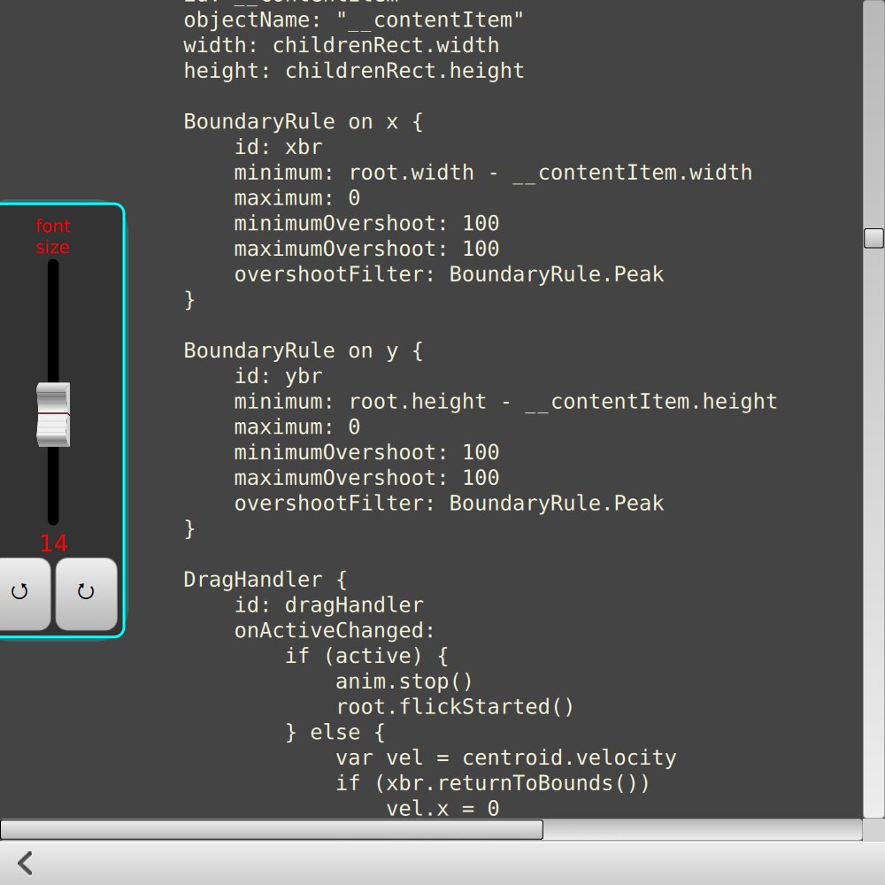 The "map" page demonstrates dragging, transformation and re-scaling an SVG Image. You should be able to zoom into a particular location on the map; and if the zoom level is changed substantially, Image::sourceSize is changed to request the SVG to be re-rendered at a different resolution. Dragging vertically with two fingers activates a DragHandler that manipulates a Rotation transform to tilt the map.