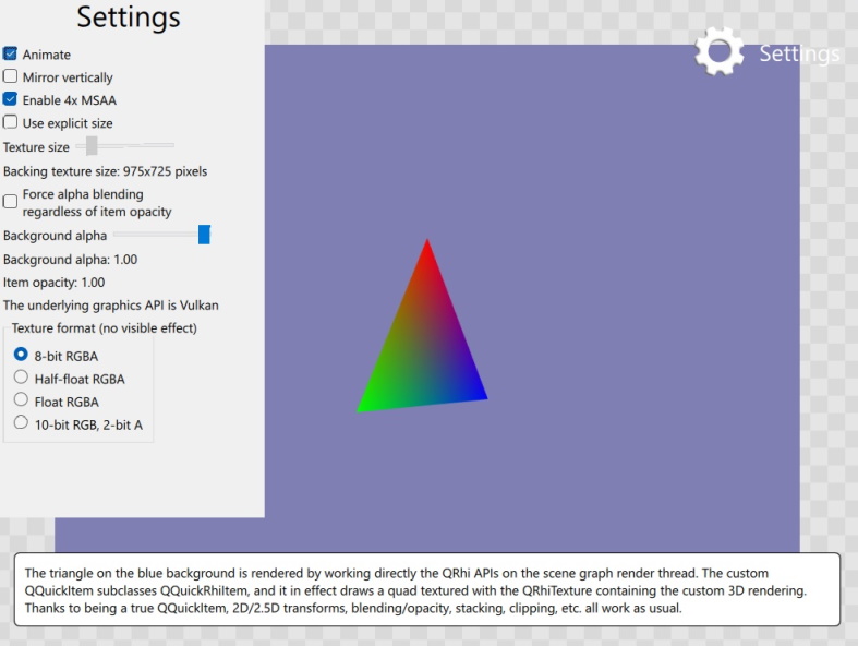 This example shows how to implement an item that performs cross-platform, portable 3D rendering into a texture using the QRhi APIs and then displays that image.