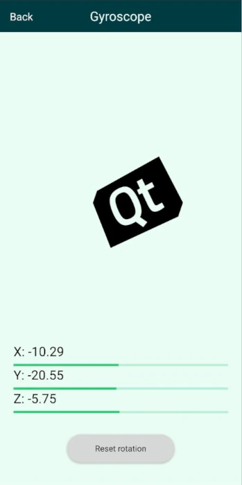 The gyroscope view also shows an image that is rotated around three axes with an amount that is calculated from the gyroscope readings. Since the gyroscope provides relative rotational change around the three spatial axes and the time between reading updates can vary, the time of the readings are stored and the rotational change is normalized based on the time passed between reading updates.