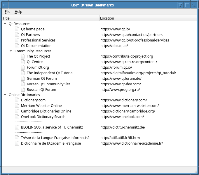 The DOM Bookmarks Application provides a reader for XML Bookmark Exchange Language (XBEL) files that uses Qt's DOM-based XML API to read and parse the files. The QXmlStream Bookmarks Example provides an alternative way to read this type of file.
