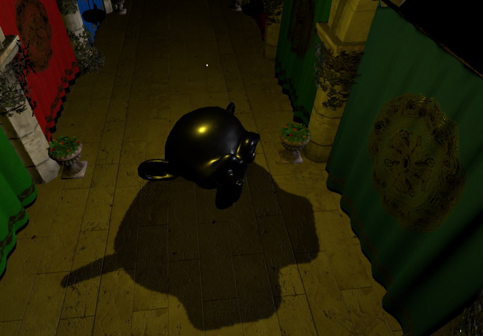 Again, a scale is applied to the instantiated Suzanne node, and the Y position is altered a bit so that the model does not end up in the floor of the Sponza building.