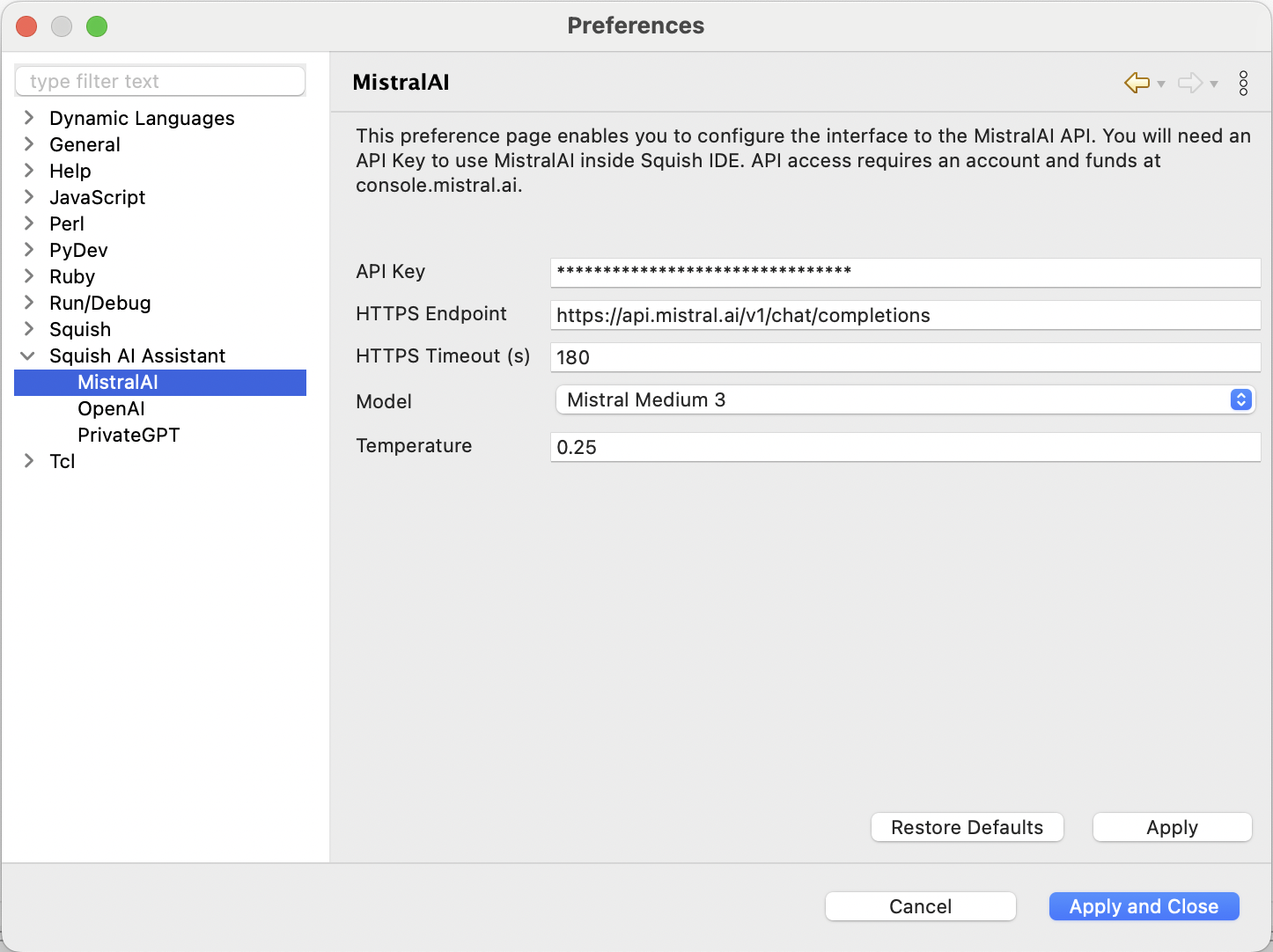 In order to use the Squish AI Assistant it is necessary to configure which Large Language Model (LLM) it should connect to. This is done through the Preferences dialog. Select Edit > Preferences to open the dialog.