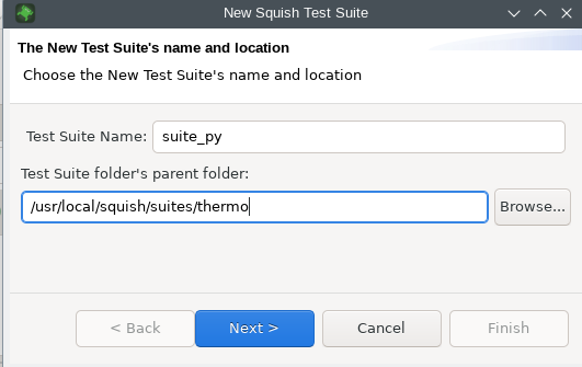 Enter a name for your test suite and choose the folder where you want the test suite to be stored. In the screenshot we have called it thermo_py.