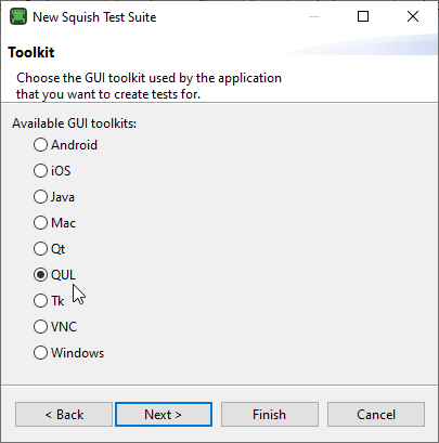 On this wizard page, we choose the Squish Toolkit / Edition we are using. For this example, we select QUL since we are automating a QUL application that is running on an MCU. Then click Next to go to the Scripting Language page.