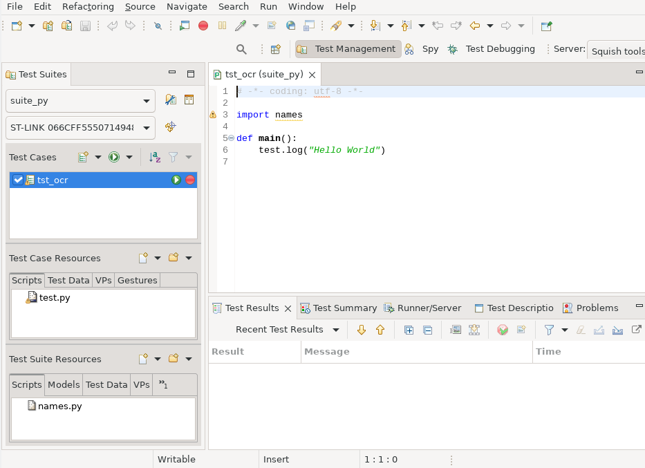 ) toolbar button to the right of the tst_ocr test case shown in the Test Suites view's Test Cases list. This will cause Squish to connect to the squishserver, hide the Squish IDE, and open the Squish Control Bar. This window will be your way to Insert (