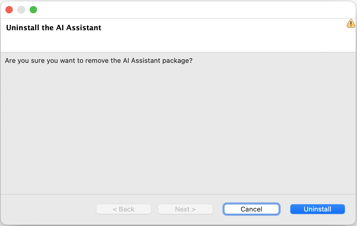 The Squish IDE provides an easy to use option to uninstall the Squish AI Assistant Extension. Select Help > Uninstall AI Assistant Extension from the menu. An Uninstallation Dialog is being opened, once you select Finish the uninstallation from the IDE takes place and afterwards the IDE needs to be restarted.