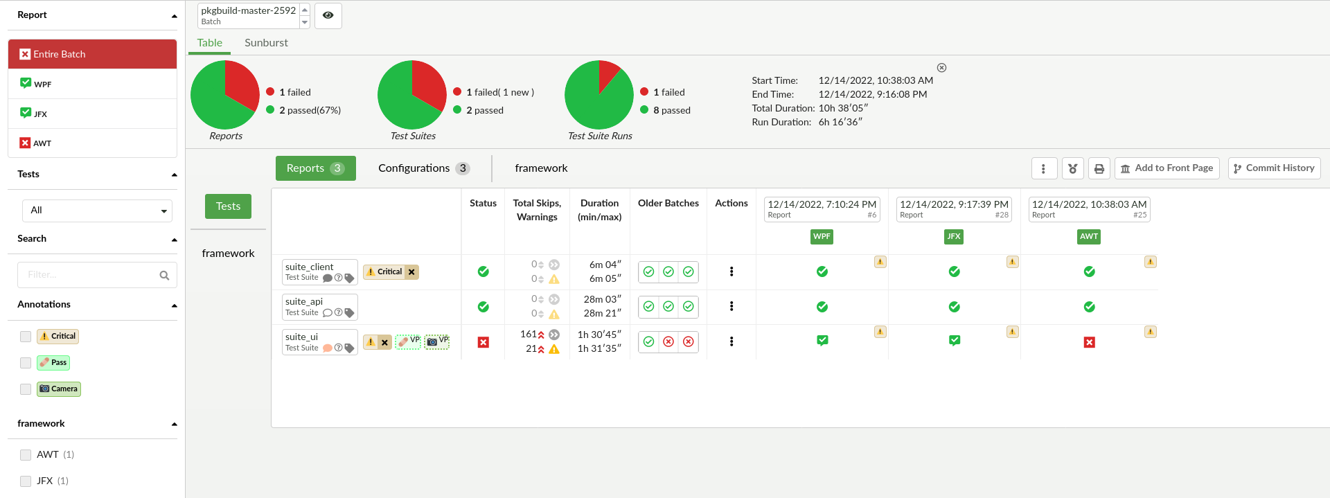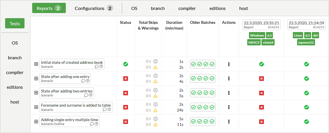 - Older Batches provides a graphical overview of the last four batches. That is, it shows whether a test passed or failed recently.