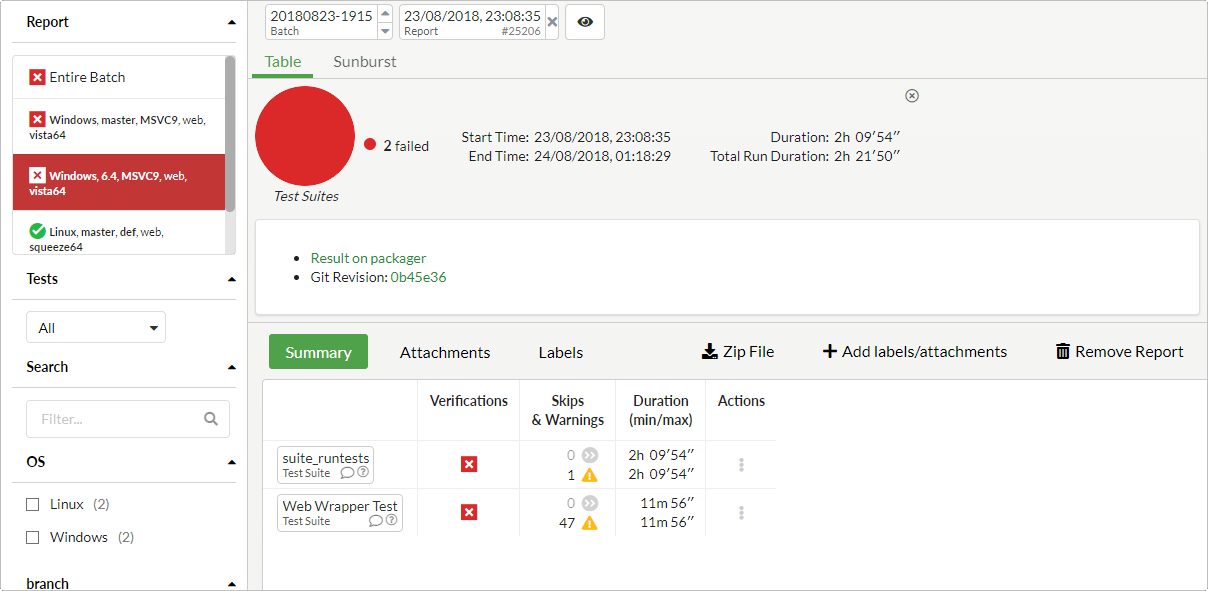 Select a report in the Report list to open the single report view and add the report to the breadcrumbs bar. The summarized test status and the labels of the report are displayed.