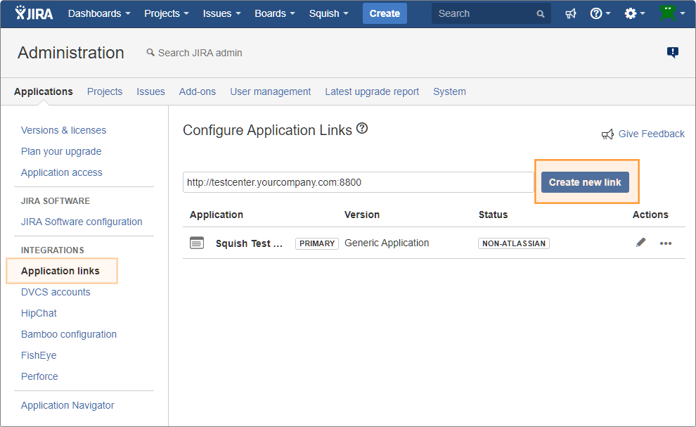 Select Integrations > Application links. In Configure Application Links, enter the URL of your Test Center instance and click the Create new link button.