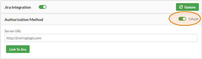 To use the OAuth authentication method, set up an application link on your JIRA instance, as instructed in JIRA OAuth Setup. When using OAuth 1.0a, you need to provide the base URL of your JIRA instance and save it by clicking the Update button.