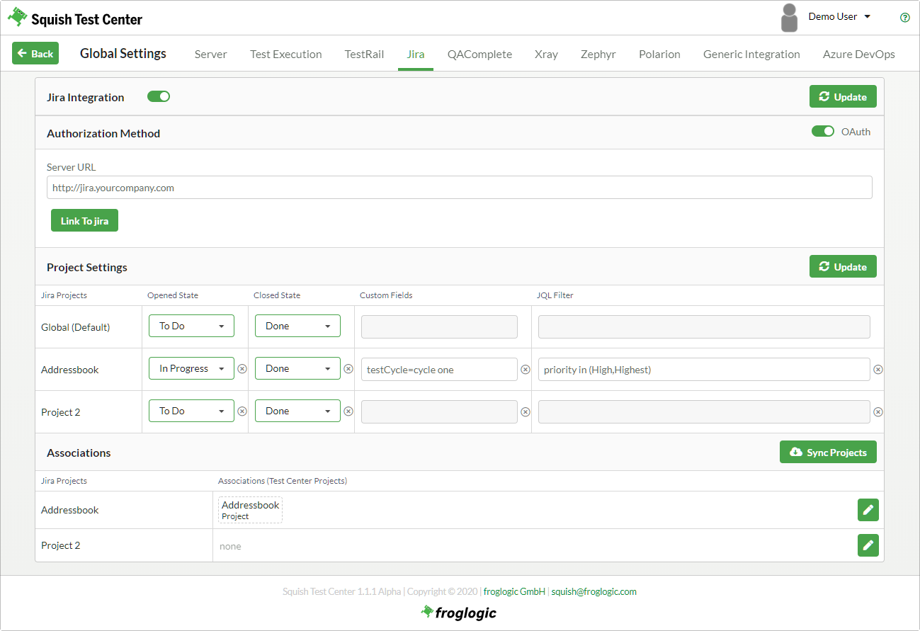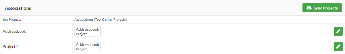 In Associations, map JIRA projects to Test Center projects. If no JIRA projects are listed, click the Sync Projects button to retrieve the current list of JIRA projects from your JIRA instance.