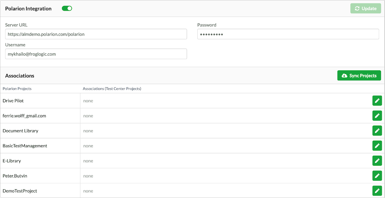 Click the Sync Projects button to fetch Polarion projects and make them appear in the Associations list, where you can map each Polarion project to its Test Center counterpart.