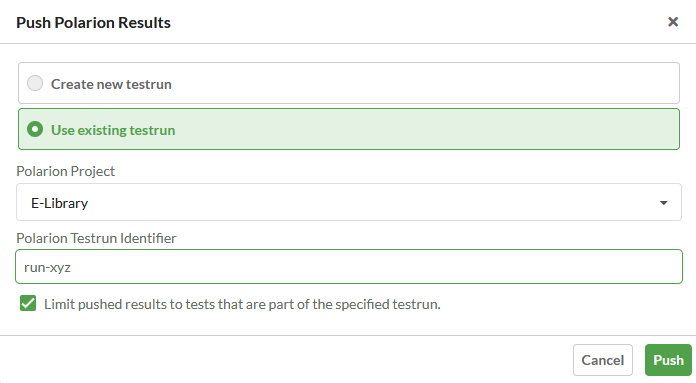 To push into an existing Polarion testrun, you first have to select the Polarion project that contains the testrun, and then you have to enter the identifier of the testrun. If Limit pushed results to tests that are part of the specified testrun is enabled, only results will be pushed that are either already part of the testrun (by manual selection or previous pushes), or that match the queries that make up the Polarion testrun. If the checkbox is disabled, all results are pushed, regardless of whether they are part of the testrun.