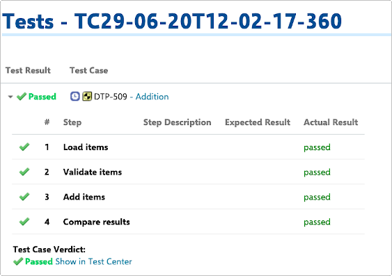 Click items in the Actual Result column to open a corresponding Test Center view.