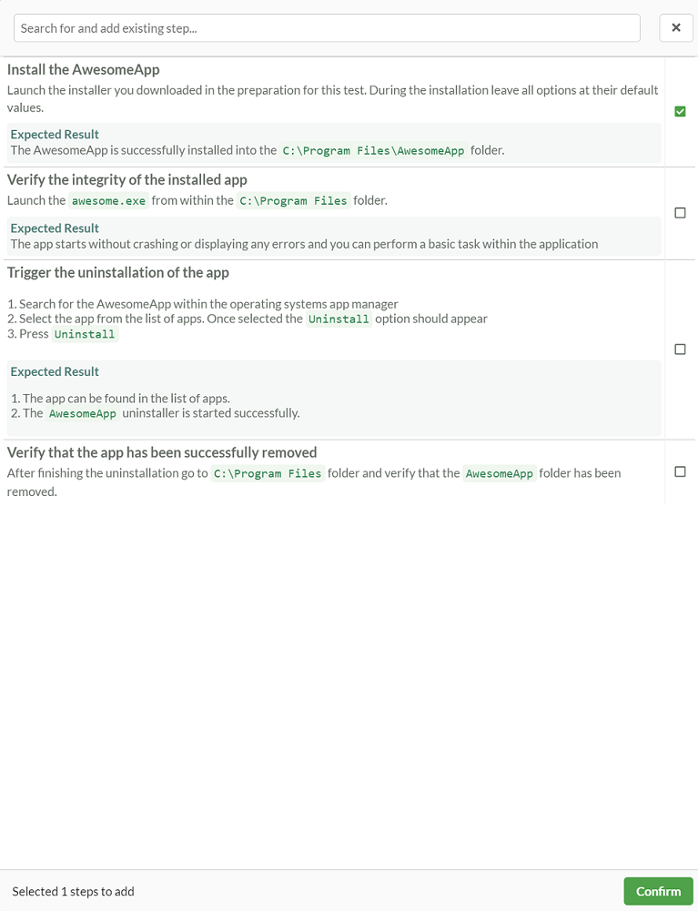 To add steps to a Test Case or Scenario 1. click the + Step button in the test details pane. 2. To reuse existing steps, click the + Existing Steps button to view all the previously created steps, search for the steps you want to reuse, select them, and click Confirm.