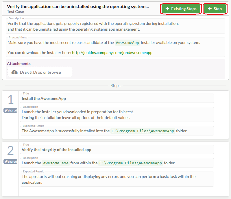 Each step consists of a Title, Description, Expected Result, and Attachments.