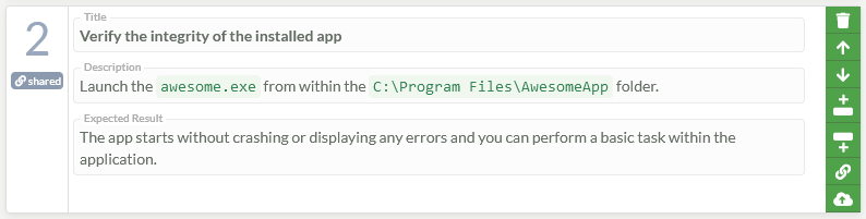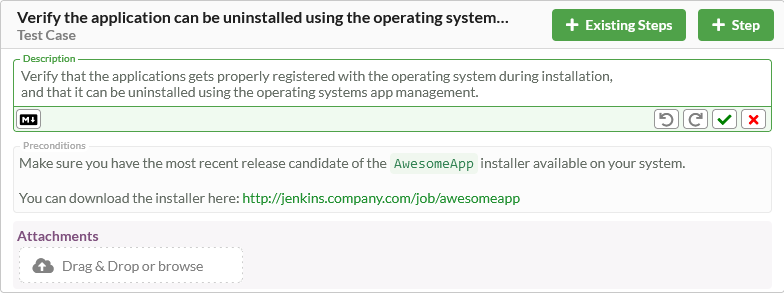 The Description field contains a more detailed description of what needs to be tested and done as part of the test step. You can use markdown notation in the description to create lists, show links, highlight important details, or to display inline images.