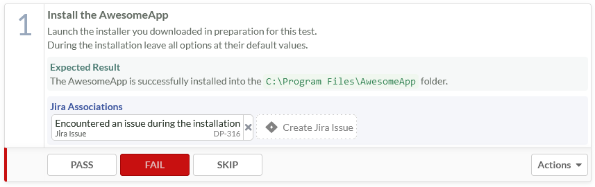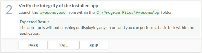 Use the buttons below each active manual test step to track the outcome of a step execution. Select PASS if you could follow the instructions and the outcome matches the described Expected Result, FAIL if you could not follow the instructions or the described expected result deviates from what you observed, and SKIP if a previous step already failed. There might be additional cases where skipping a step might be necessary, so you should carefully decide on a case-by-case basis whether to skip a step.