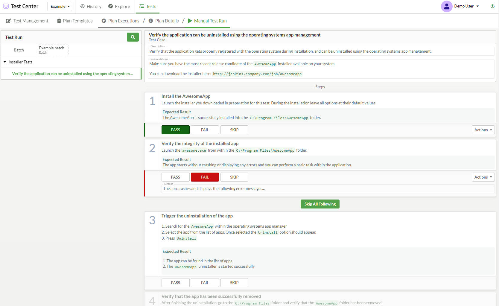 At any point in time, if you encounter a failure or need to skip a step for some other reason, click the Skip All Following button below the step you just skipped or failed. The status of all following steps in the test case or scenario is set to skipped.