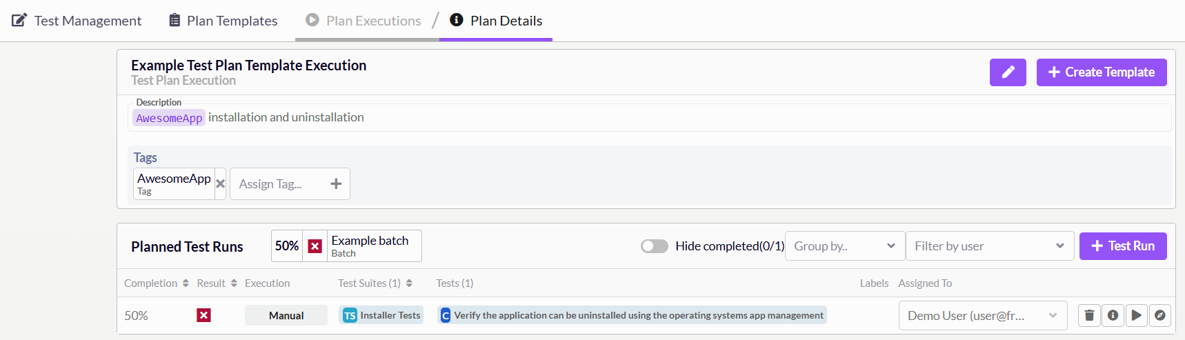 Click on your plan execution and you will end up on the Plan Executions Details view, here you can assign users and start working on manual tests. For more details on how to use this view check out the test plan executions documentation The Plan Details tab for the created Test Plan Execution displays all planned test runs, whether they are finished or in progress. The header of the Planned Test Runs table shows the overall completion and a link to the batch results.