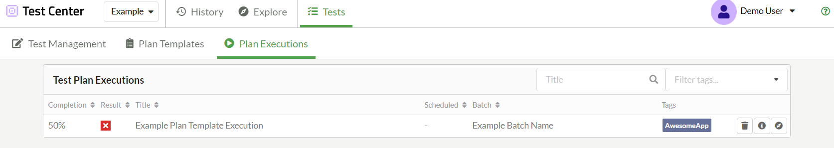 Scheduling a test plan template will create a test plan execution and take you to the Plan Executions Details view. You can also find it on the Plan Executions tab where you can search or filter by tags to find the execution you created.