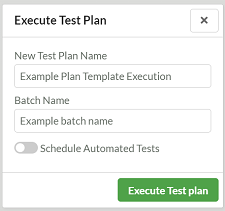 In the Execute test plan dialog you need to fill in the mandatory fields: a unique test plan execution name and batch name, which is the results for the test runs of the test plan are stored. You'll also have the option to schedule automated tests, you can find out more about them in the Automated Test Execution section.
