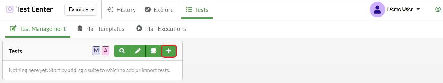 Select the + button on the top of the Tests pane to add a new test suite.