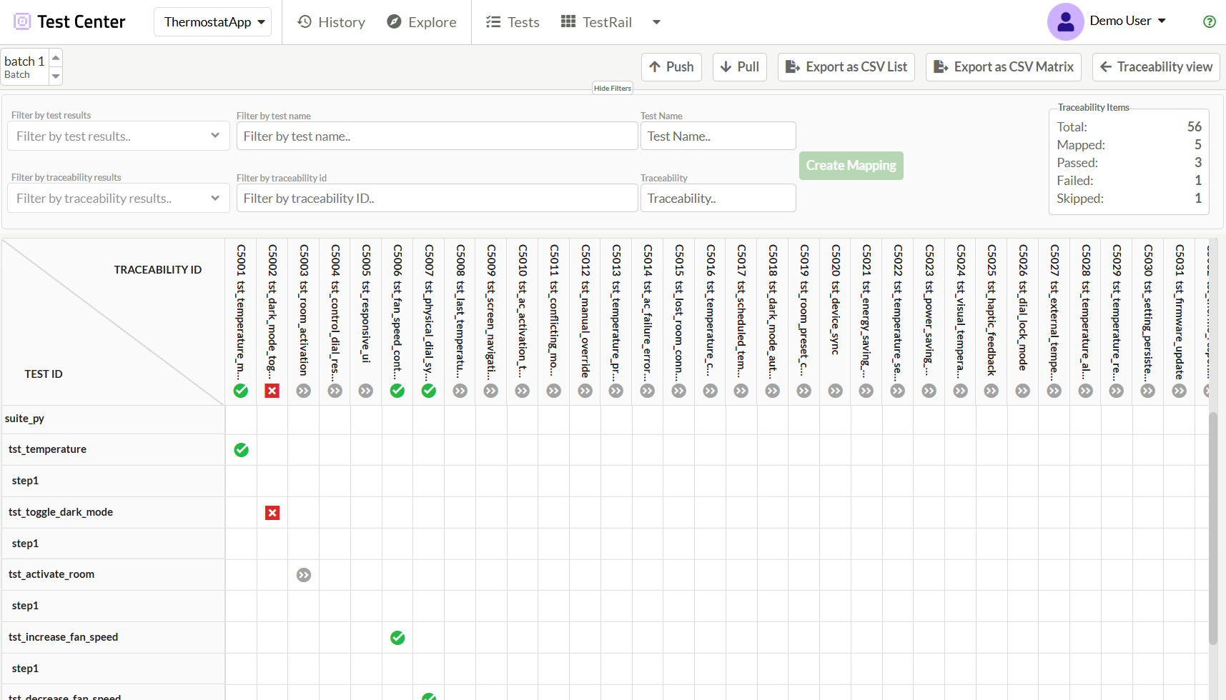 This matrix helps you visualize and manage the relationships between tests and traceability items in a structured matrix format. This tutorial will walk you through the different sections of the page and how to use its features effectively.