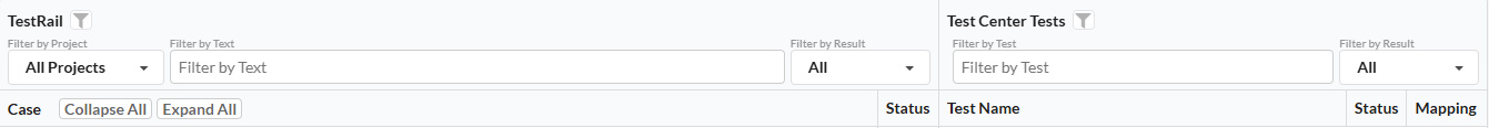 In this view, the traceability table will contain items from the external system in the left side and associated Test Center tests in the Test Center Tests column. The status of each external item shown on the left is an accumulation of the results of each of the associated tests that were executed in the currently selected batch. Right now there are no associations made, so the table will look relatively uninteresting.